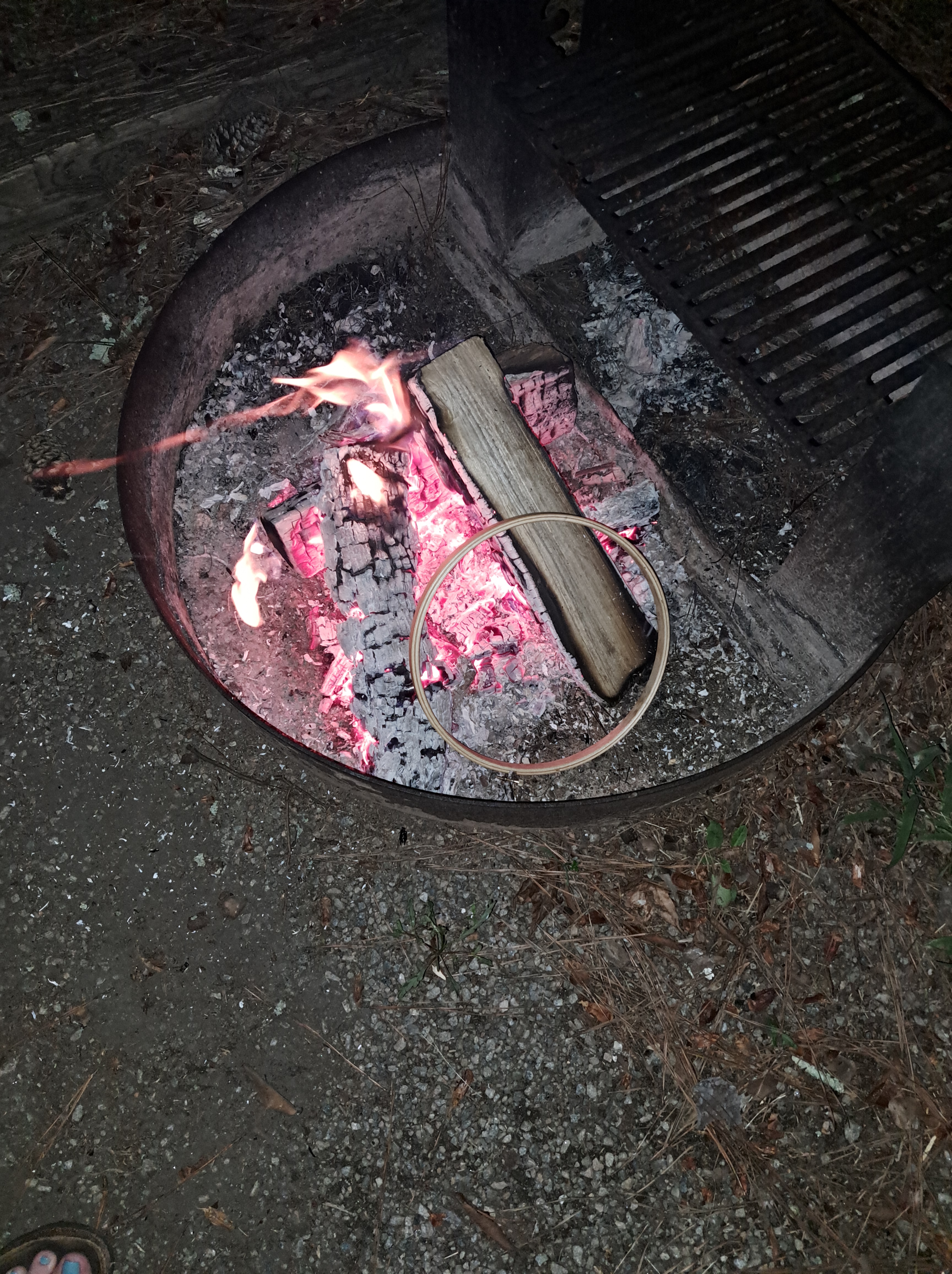 Beyond my life as professor, I am deeply in my embroidery era (and sewing…see vintage camper restoration!). I do a variety of needlework, mostly hand embroidery. I started that journey almost seven years ago and have quite a collection of tools of the trade by now. While we were camping, I realized I packed one of my early purchases, a very cheap 10″ embroidery hoop that was not properly holding fabric tension (which is vital).